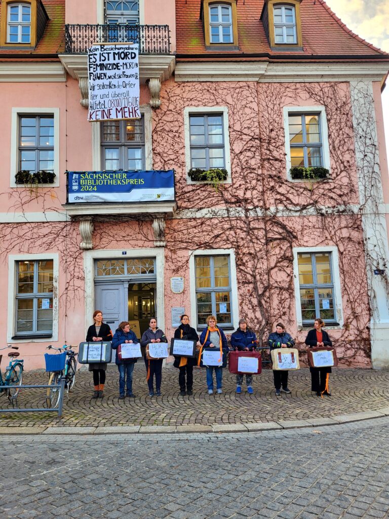 Am Montag, dem 25. November 2024, fand in der Wurzener Innenstadt unter dem Titel „Ihr könnt mich mal. Ich bin jetzt weg!“ eine eindrucksvolle Performance zum Internationalen Tag gegen Gewalt an Frauen statt. Eine Gruppe von Frauen, gekleidet in Schwarz und Orange, zog mit Koffern beladen auf den Marktplatz, um auf die oft unsichtbare Gewalt gegen Frauen aufmerksam zu machen. Ihr bewegendes und eindrucksvolles Auftreten sorgte für einen Moment der Besinnung und hinterließ einen bleibenden Eindruck bei den Passant*innen. Die Frauen des Fella Circle Markkleeberg zogen am 25.11. ebenfalls die Fahne „Wir sagen NEIN zu Gewalt gegen Frauen“ vor dem Rathaus in Markkleeberg auf und auch in Borna wurde sie von der Gleichstellungsbeauftragten Konstanze Morgenroth gemeinsam mit dem Landrat sowie Vertreter*innen aus Wirtschaft, Zivilgesellschaft und lokalen Initiativen aufgezogen. Kreativ begleitet wurde das Aufziehen der Fahne online von Unternehmerinnen der Region sowie den engagierten Kleinstadtladys, um die Thematik weiterzutragen. Am Busbahnhof Borna fand die Plakatkampagne „Ausweg finden“ statt. Die Kampagne, die für sechs Wochen in den Bussen der Thüsac präsent sein wird, weist auf das Hilfetelefon im Landkreises Leipzig hin. Ein Schmetterling, der einen Käfig durchschneidet, symbolisiert den Weg in die Freiheit – ein Motiv, das Mut macht und Hoffnung gibt. Außerdem gibt es die Ausstellung „Frauen der Geschichte – In Kurzgeschichten“ noch bis zum 24.01.2025 im Rathaus Markkleeberg zu sehen.